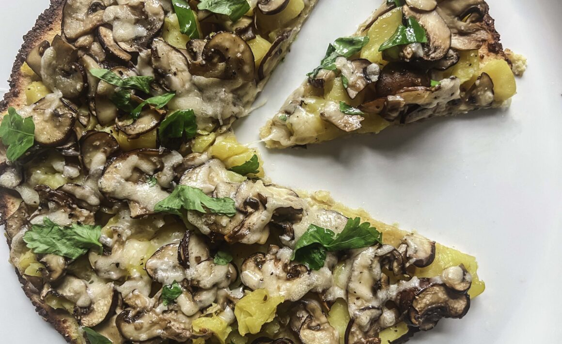 Food Pharmacyn pizza perunamurskalla, sienillä ja valkosipulilla varustettuna