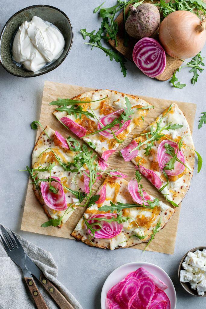 Pizza Bianco med chèvre, karamelliserad lök & polkabetor