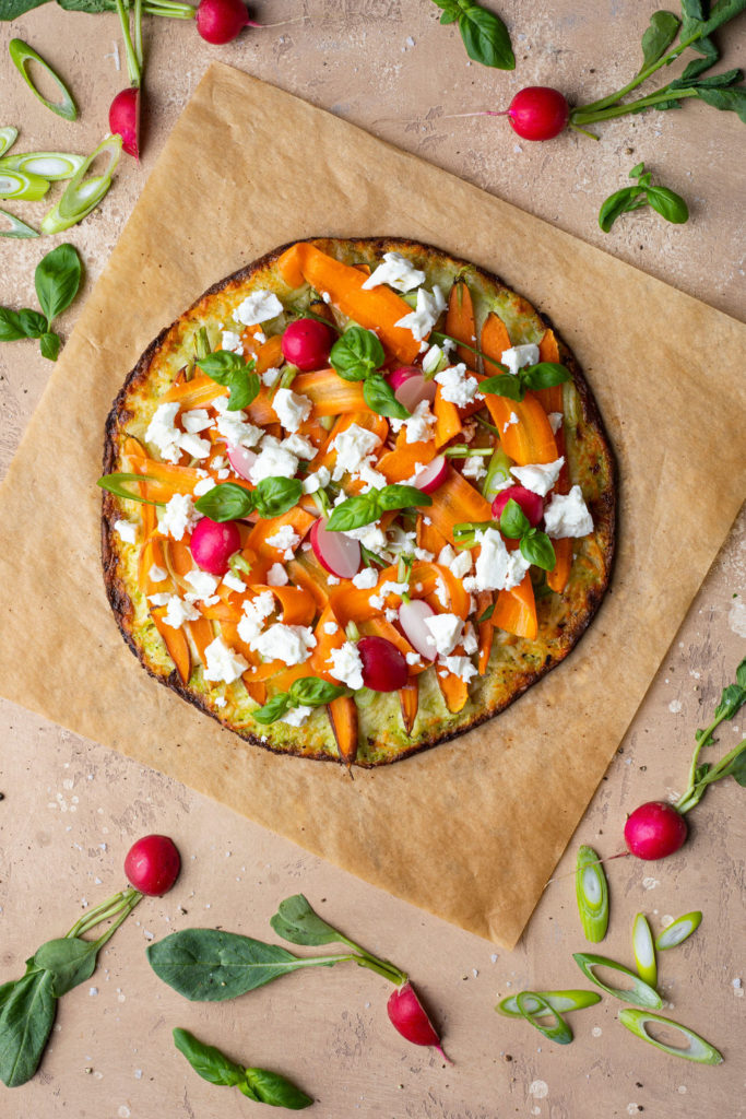 Pizza Bianco med rostade och picklade morötter, basilikakräm och fetaost