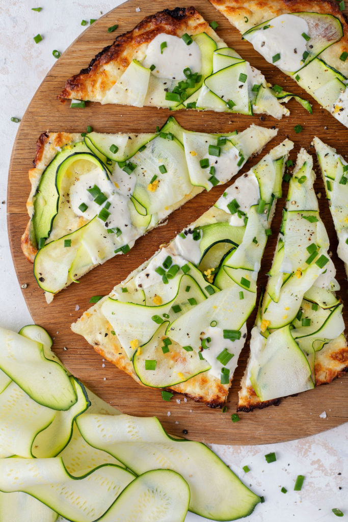 Pizza Bianco med zucchini, pepparrotskräm och gräslök
