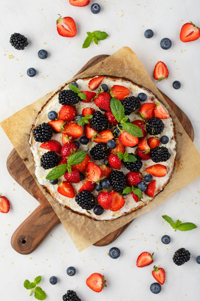 Dessertpizza med citronmarinerade jordgubbar, färska bär, citron och mynta